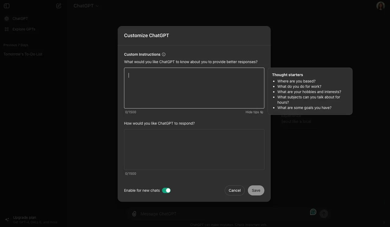 Quer dar um toque mais humano na forma como o seu ChatGPT fala com você? Sem crise, dá para fazer isso só usando o recurso de instruções do próprio Chat. Para encontrar essa função clique na sua foto de perfil → “Customizar ChatGPT“.