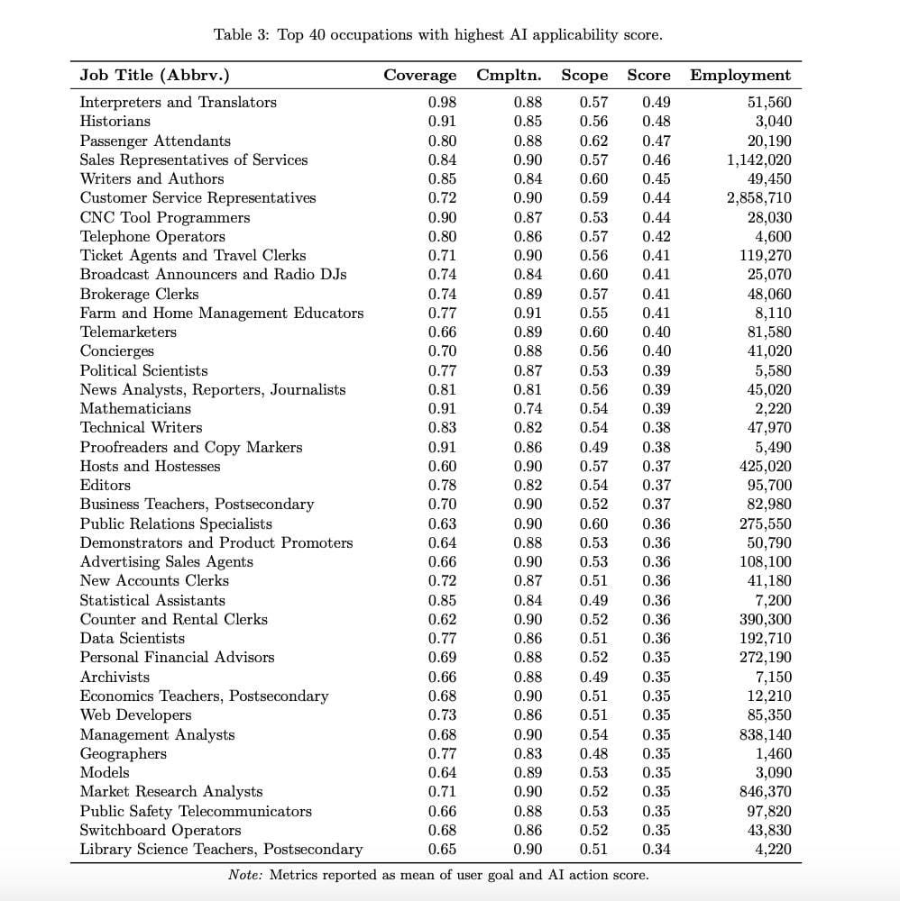 A Microsoft analisou 200.000 conversas de usuários com o Bing Copilot para calcular uma "pontuação de aplicabilidade da IA" — mostrando a facilidade com que a IA pode auxiliar ou substituir diversas profissões. Óbvio que fui pegar a lista para compartilhar com vocês.