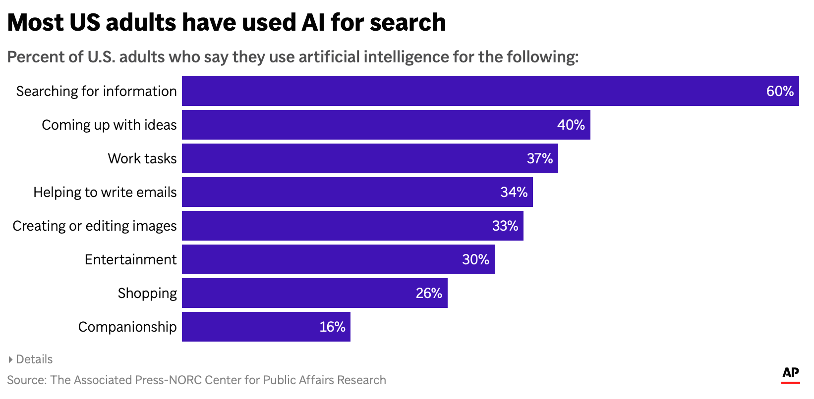 Os números são de cair o queixo: 60% dos americanos já usam IA pra buscar informação. Mas quando você olha pros jovens abaixo de 30 anos? Pula pra 74%.