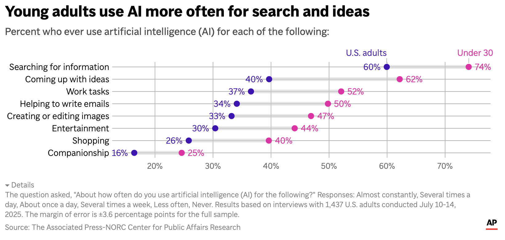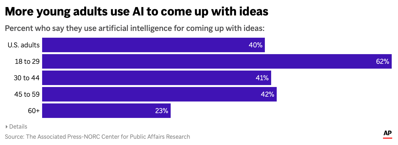 Descobri uma coisa curiosa esses dias: meu sobrinho de 9 anos não sabe mais o que é digitar. Quando precisa de alguma informação, ele fala para o celular escrever. "Tio, pra que digitar se falar é mais fácil" - ele me disse, como se fosse a coisa mais óbvia do mundo – sendo que até 2 anos atrás os computadores mal conseguiam entender o que falávamos. E sabe o mais doido? Um estudo fresquinho da AP-NORC que saiu agora em julho mostra que ele não está sozinho nessa uso da IA de forma natural, sem pensar.