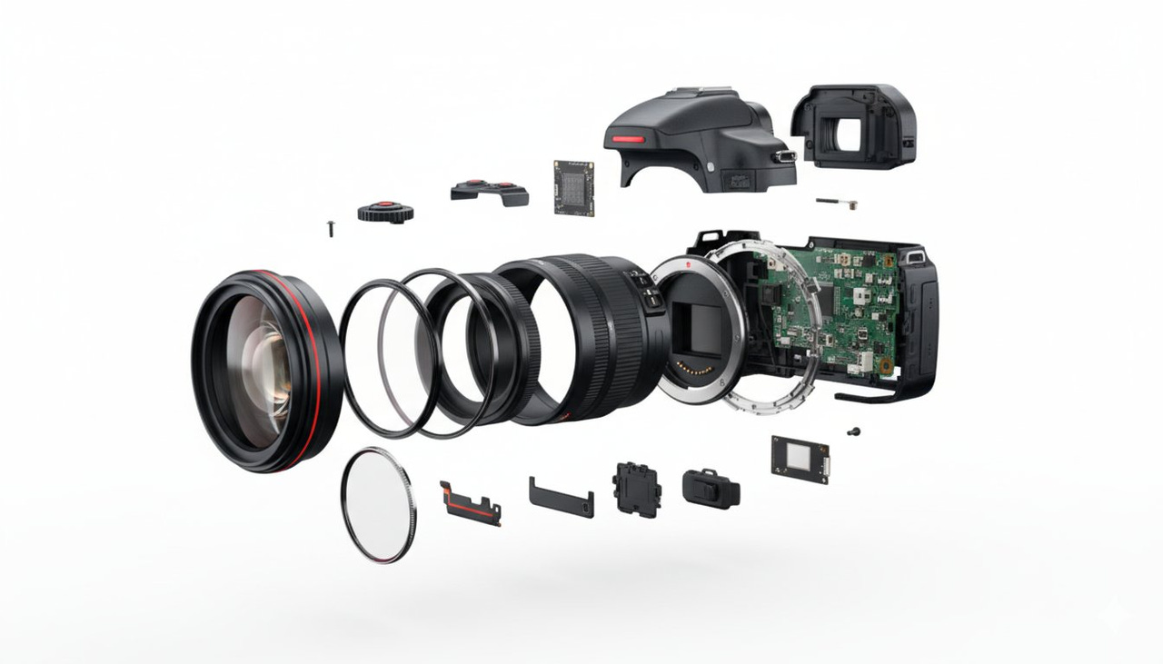 Exploded view of a DSLR showing all its accessories and internal components such as lens, filter, internal components, lens, sensor, screws, buttons, viewfinder, housing, and circuit board. Maintain red accents of the DSLRNo botão abaixo você encontra um repositório com mais de 110 prompts prontos de edição de imagem de forma simples. Vale a pena conferir porque acredito que tem 100% dos casos de uso que você já imaginou para uma edição de imagem.