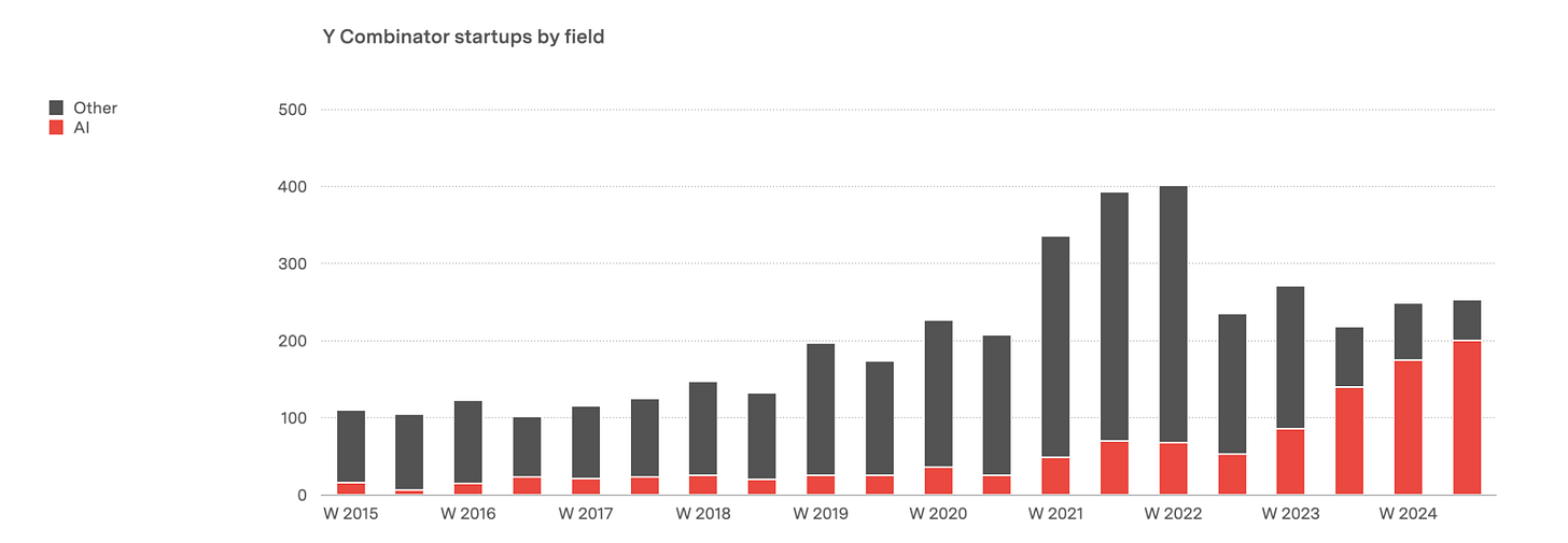 Como podemos ver no gráfico abaixo, não foi o número de tipos de empresas que diminuiu, todo mundo só achou uma desculpa para falar que a sua empresa é uma versão nova de IA. Quando que, cá entre nós, tá todo mundo só colocando uma capa bonita em cima de uma IA já existente.