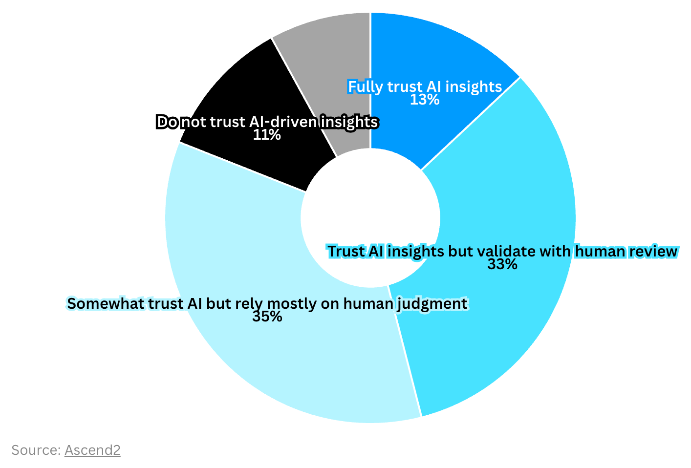 De acordo com o relatório analisado, apenas 13% dos profissionais de marketing confiam totalmente nas informações geradas por IA para decisões críticas. A maioria (68%) ainda prefere validar os dados com revisão humana ou equilibrar a intuição com as sugestões da máquina. Esse cenário revela um ponto fundamental: a IA pode até ser uma assistente poderosa, mas ainda precisa da sensibilidade humana para decisões mais complexas.