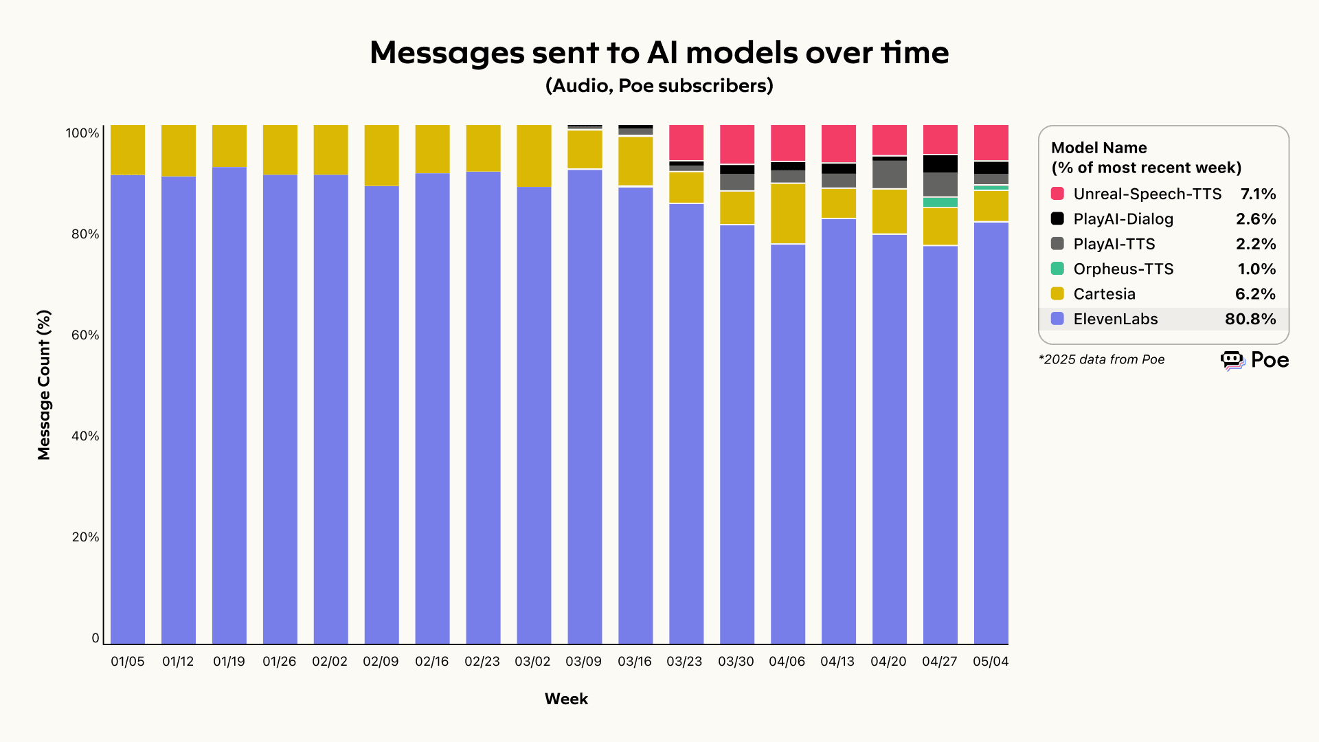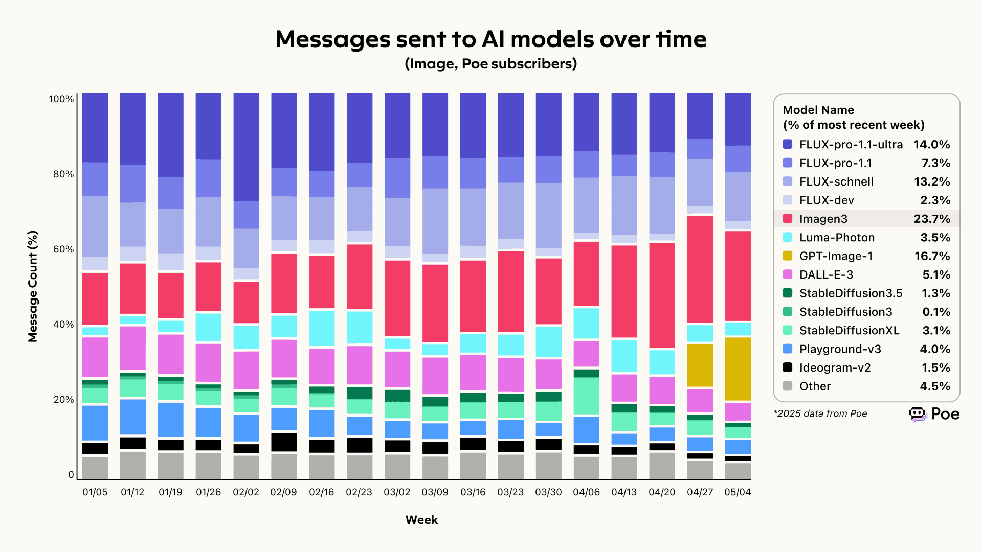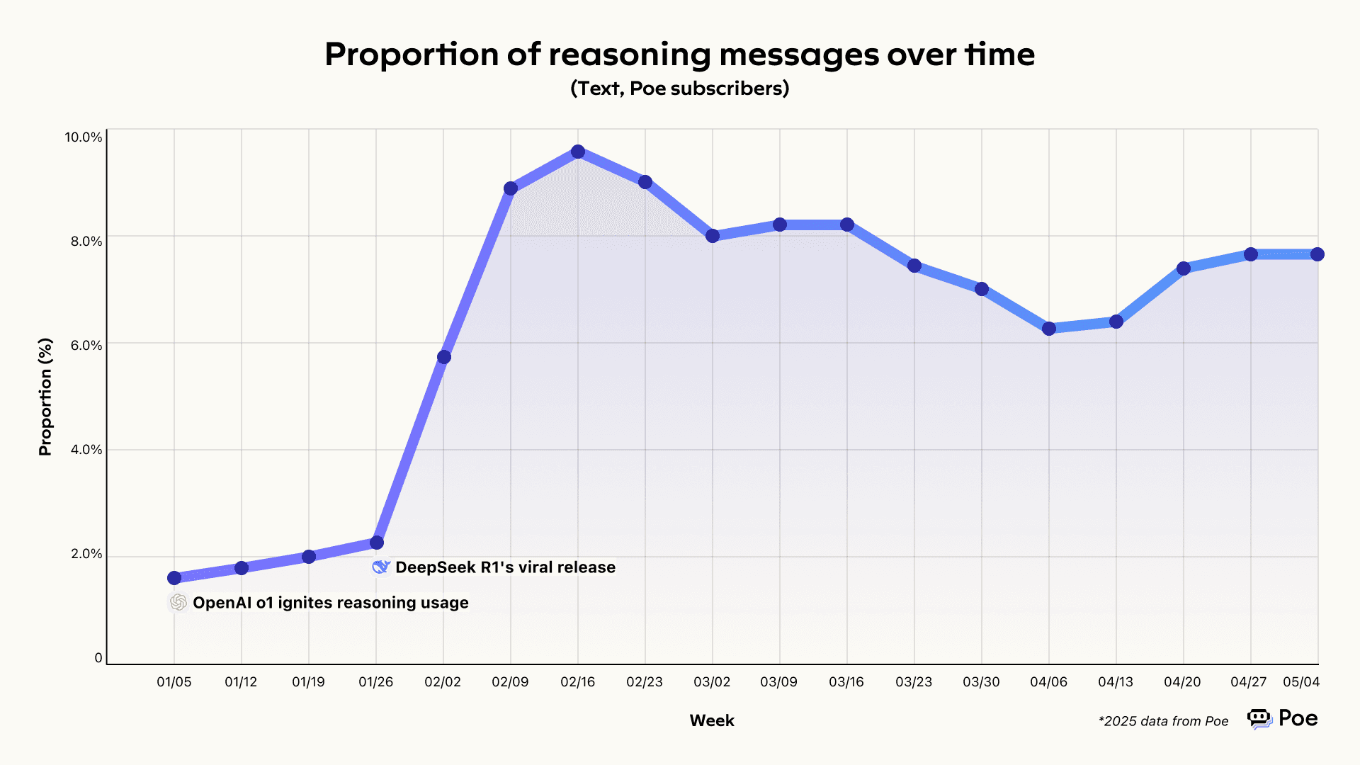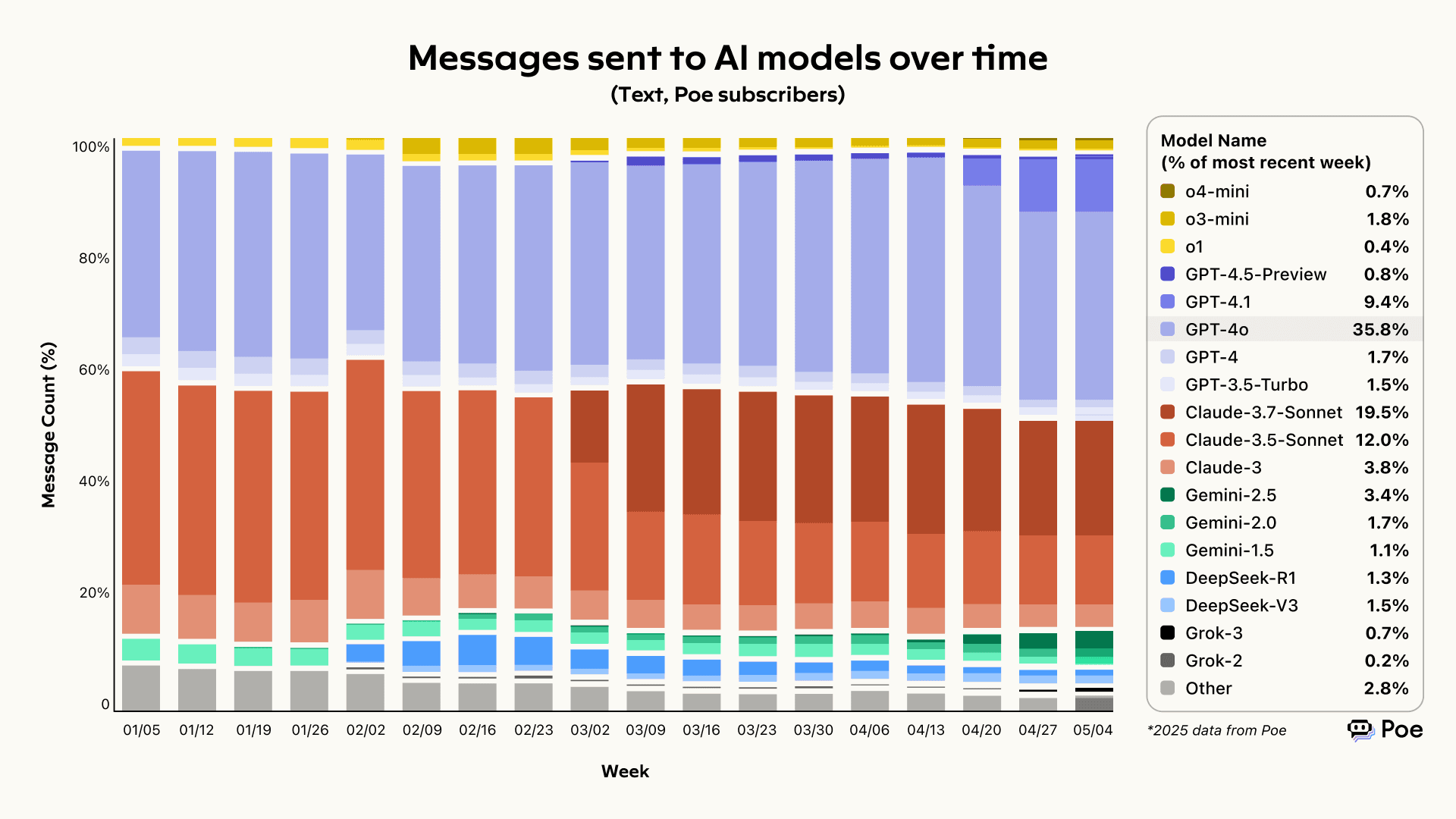 A plataforma Poe apresentou em seu último relatório de uso mudanças significativas na adoção de modelos de inteligência artificial durante o início de 2025. Com base nos dados de uso dos usuários, as principais conclusões são: