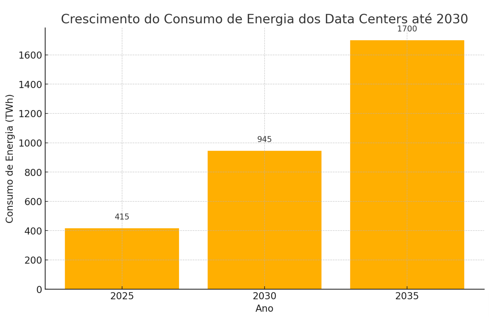 Segundo um relatório recente da Agência Internacional de Energia (IEA), até 2030, o consumo de eletricidade dos data centers, impulsionado especialmente pela IA, deve dobrar de 415 TWh atuais para incríveis 945 TWh. Para se ter ideia, isso é mais que toda a energia elétrica consumida pelo Japão hoje! E se essa tendência continuar, até 2035, estaremos falando de um consumo que pode variar de 700 até impressionantes 1700 TWh.